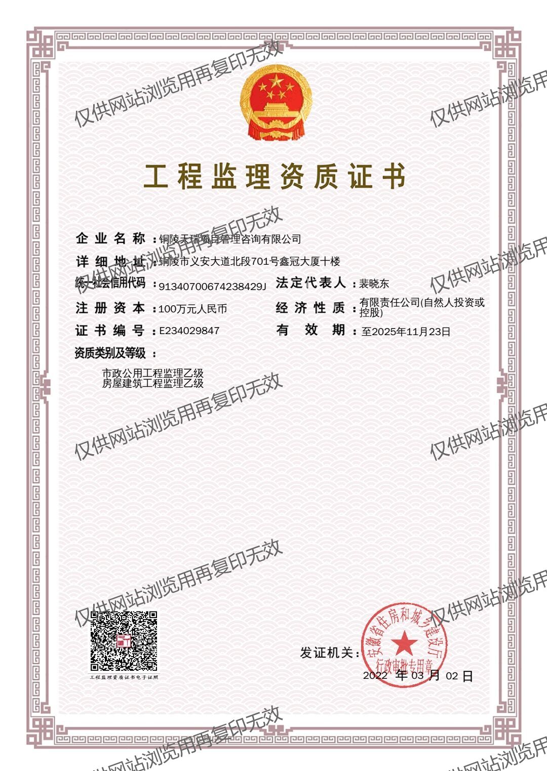 銅陵天瑞項目管理公司具有:工程監理乙級資質、工程造價乙級資質、招標代理及政府采購資質(備案)、工程咨詢資質(備案)等資質。